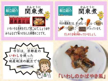 主菜の『いわしのかばやき風』の「いわし」は,京都産の「いわし」が届きました。その土地でとれたものをその土地でいただくことを地産地消と言います。環境にやさしいです。