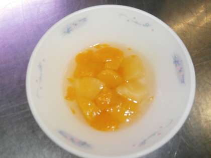 デザートは,フルーツミックス缶(りんご・パイナップル・みかん・黄桃)を寒天で固める『フルーツ寒天』でした。粉寒天を砂糖といっしょに煮溶かし,缶詰のフルーツを加えると子どもたちが食器に配っている時は液体なのに,デザートとして食べる頃には固まります。