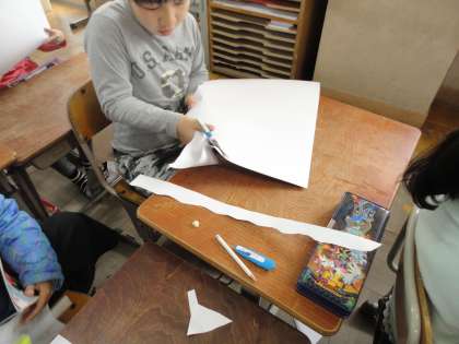 図工科「はさみの あーと」では,「切ることを楽しみ,切った形から見つけよう」をめあてに学習に取り組みました。白い画用紙をどんどん切っておもしろい形をたくさん作りました。「先生,北海道の形みたいや!」「先生,ハート〜♡」「先生,象ができたよ♪」切った後は,黒い画用紙の上で構成するイメージを広げ,何度も試しながら並べ方を工夫し,自分が楽しいと思える形を見付けようとしていました。子どもたちの想像力にはいつも驚かされます。