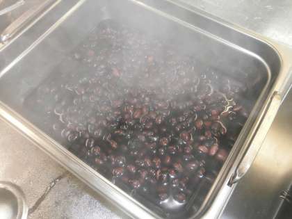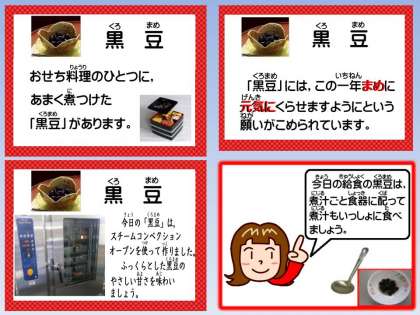 今日の給食は,お正月料理『黒豆』でした。スチームコンベクションオーブンでじっくり煮ました。おせち料理を家庭で食べる経験のない子どももいますが,おせち料理に込められた願いを給食カレンダーや電子紙芝居「給食室からこんにちは」で知って,味わって食べることができました。やさしい甘味で『さけだいこん葉のまぜごはん』と『みそ汁』の組み合わせがとても食べやすかったです。欠席も多かったのですが,しっかり食べられていました。