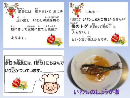 「いわし」を食べる意味や「豆まき」の意味を知って,1年の幸せを願って『いわしのしょうが煮』・『いり豆』を食べました。
