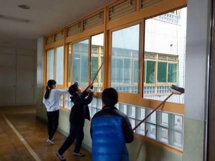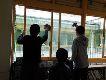 窓を拭いているうちに,窓よりも落下防止のためのネットがとても汚れていることに気づいた子どもたち。
