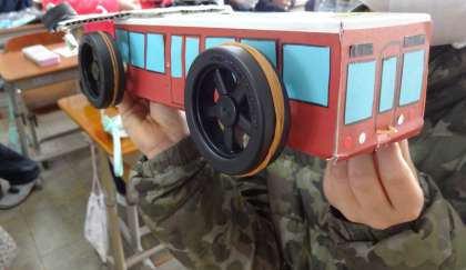 3年生の時に学習したゴムの力をいかして,いかに遠くまで走らせることができるのかを競います。