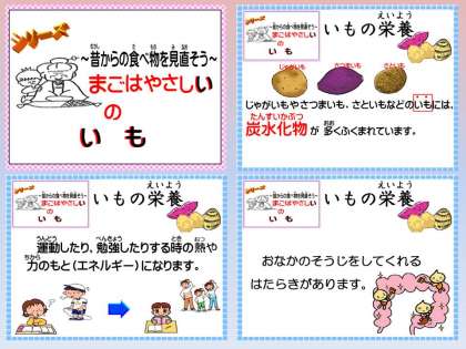 給食カレンダーや電子紙芝居「給食室からこんにちは」で,今月のテーマ「ま・ご・は・や・さ・し・い」のいもの栄養について紹介しました。「煮物のじゃがいもは苦手だけど,今日のじゃがいもは大好き。」と料理によっても好き嫌いがわかれるようですが,いもの栄養を知って,健康な体づくりのためにしっかり食べてほしいものです。