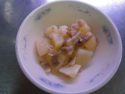 『ジャーマンポテト』は,ジャーマンつまりドイツの料理です。ドイツでは,主食はパンですが,一日に一度は必ずじゃがいもを食べると言われています。今日は,スチームコンベクションオーブンでじゃがいもを蒸して 大きな回転釜を使ってベーコンを炒め蒸したじゃがいもを加えて塩こしょうで味付けをしました。