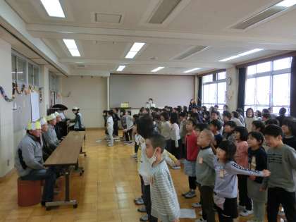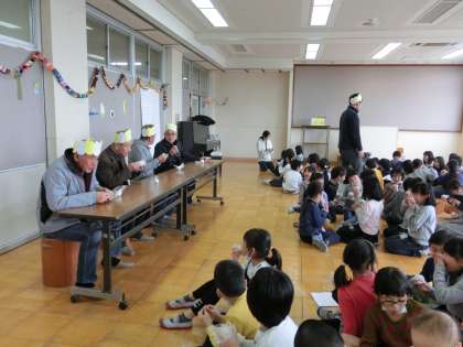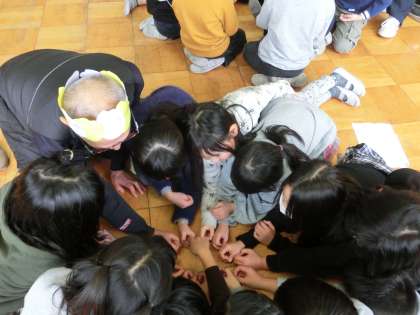 お米作りでお世話になった地域の方々をお招きし,お米パーティーを開きました。4人のお世話になった地域の先生方と一緒に子ども達が作ったおにぎりを食べたり,「ずいずいずっころばし」で一緒に遊んだりしました。最後には感謝の気持ちを伝えるために歌をプレゼントさせていただきました。本当に1年間お米のことを教えていただきありがとうございました。