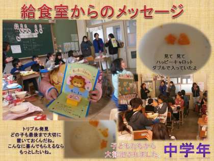 突然の訪問と素敵な飛び出すメッセージカードに大喜びの子ども達。調理員さんたちの思いやりに心から感謝。益々給食大好き間違いなしです。