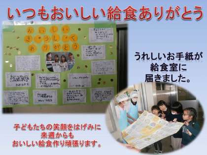すると,思いがけなく「いつもおいしいきゅうしょくありがとう」のお手紙が届きました。