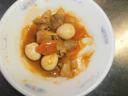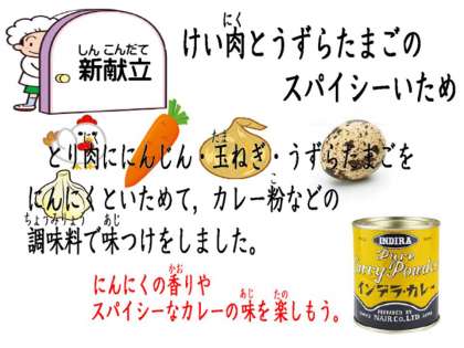 今日の給食は,2月の新献立『鶏肉とうずら卵のスパイシー炒め』でした。鶏肉をにんにくでよく炒め,カレー粉をきかせたスパイシーな料理です。