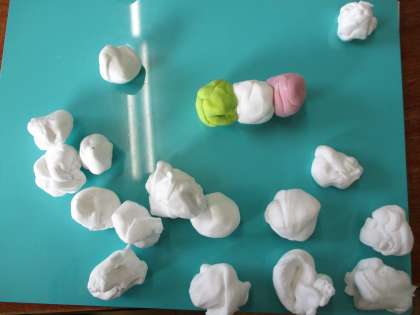 「これは,クリームだから…」とねんどの量を考えて想像を膨らませています。