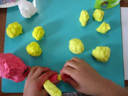 図工科「ごちそうパーティーをはじめよう!」の単元では,紙ねんどに色をつけるため,何度もこねて綺麗な色が出るようにがんばっているところです。