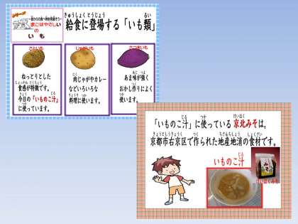 今年度は,給食カレンダーのテーマとして「まごはやさしい」の食べ物について紹介しています。2月は,「い」のいも煮ついて詳しく紹介していて,今日は,給食に出てくるいもの種類を紹介しました。『いものこ汁』で「里いも」について知った子どもたちでした。
