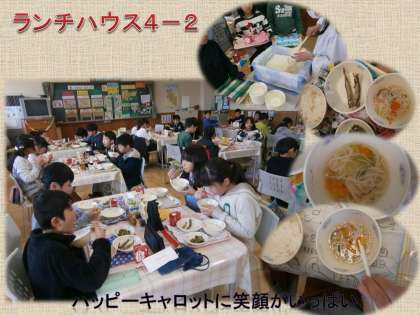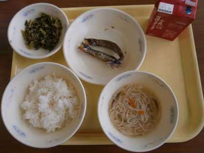 ツルツルとのど越しの良い「そうめん」が入った暖かい汁物『にゅうめん』は,ハッピーキャロットがたくさん入っていて色取りもよく,地産地消の「九条ねぎ」の色と香りと歯触りも楽しむことができました。見つけたハッピーキャロットは,最後まで大事に食器の中に置かれていて,子どもたちのうれしい笑顔を見守ってくれていました。