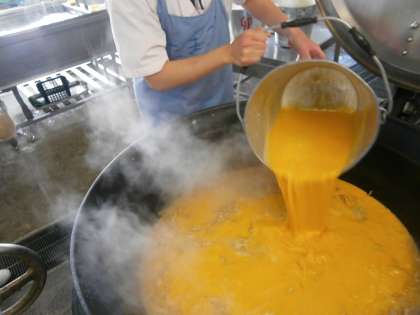 今日の給食は,たまご料理『あげたま煮』でした。熱湯につけて油抜きした油あげをせん切りにし,だし汁とさとう,しょうゆで煮て味を含ませておきます。調味液で軟らかく煮た野菜に油あげを加え,とき卵でふっくらととじます。大量調理では,こがさないために調理のコツが必要です。釜を2つにわけて ゆっくりやさしく卵を加えて蓋をして,しばらく蒸し煮にする要領で作ります。今日もふっくらふわふわに仕上がりました。
