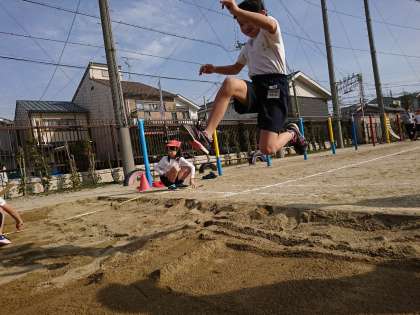 この運動は,走ってきてジャンプするだけなのですが,なかなか奥が深いです。「踏切の足はどちらがいいのかな。」「うではどう使ったらいいのかな。」と工夫を重ねています。男子世界記録8.95mにどれだけ近づけるのか楽しみです。