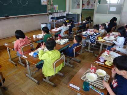 2回目の今日の給食は,麦ごはん・牛乳・ホウレンソウのいためナムル・五目どうふ・じゃこでした。今日は,和食のメニューで担任団は少し不安もありましたが,頑張って食べる姿に安心しました。