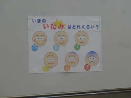 「今の痛みはどのくらい?」を教えてもらいました。ケガや体の痛みがどのくらいなのかを自分で知るというものです。思っていたよりも痛くないなとか,以前よりも痛いから保健室に行こうと自分で考えられるようになるそうです。