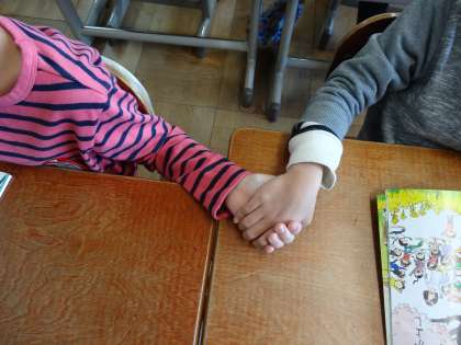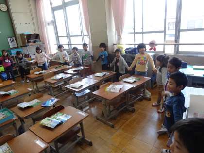 参観日の次の時間は,教科書の詩の「つながる」と「まるくなる」を実際に教室で演じてみました。