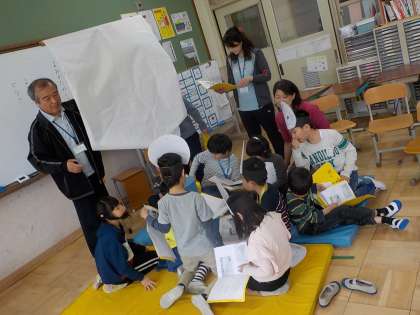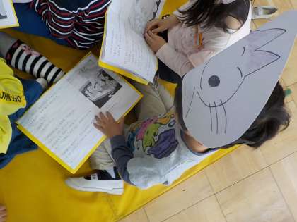 お面をかぶって,みんなで音読劇を楽しんでいます!