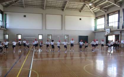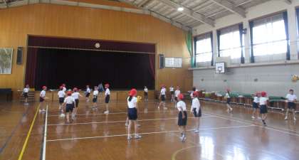 体育の学習で「ソフトバレーボール」をしています。まずは,ウォーミングアップ!!全員で手をつないでボールの行方を追います。子ども同士のかかわりを大切に,楽しく体を動かしていきます。