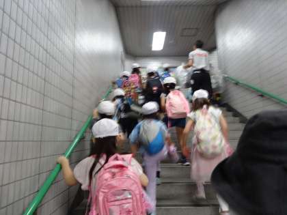 電車では,他の学校の遠足と重なり満員電車でした。