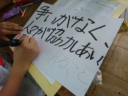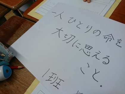 ゲストティーチャーの方の話を聞いて,もう一度「戦争」と「平和」について話し合いました。「本当の平和って何?」と問い直してみると,深い答えがたくさんかえってきました。修学旅行でさらに,平和についての考えを深めていきたいです。