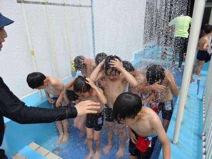 中間休みからお日様が顔を出し暑くなってきました。お天気に恵まれ,プールの入り方を確認しました。まずは,腰つかり槽とシャワーです。終わった人から座って待ちます。