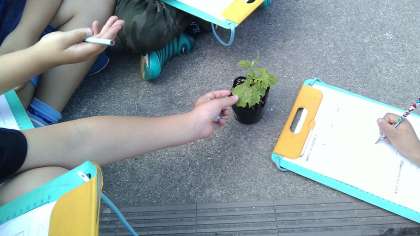 4年生は,理科の学習で春から,ツルレイシを育てています。ツルレイシが少しずつ大きくなってきています。今日は,ツルレイシの芽の観察をしました。