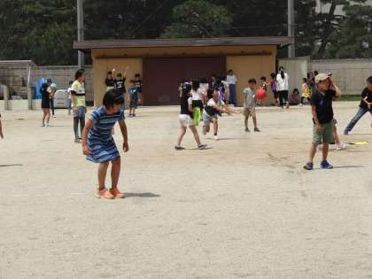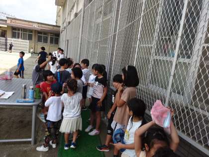 黄組(1−2)は,今日は運動場での活動でした。帽子を被り,水筒を持参して活動しました。ドッジボールや鬼ごっこが多かったです。休憩をこまめにとり,校舎側のミストの場所は大人気でした。