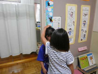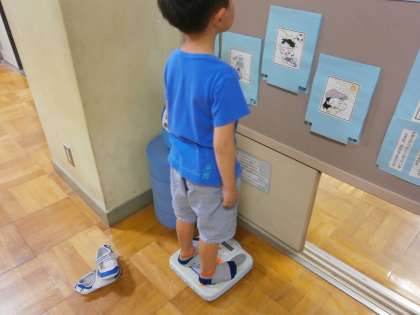 2学期から,保健室前廊下に「身長・体重コーナー」を作りました。子どもたちは「背がこんなに伸びた!」,体重も自分の体重だけでなく「ランドセルと背負ったままやったら,○○キロやったで!」などと,計って楽しんでいます。