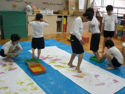 大きな和紙をつなぎ合わせて手や足で,絵の具を使いトントンペタペタ,鯉のうろこの部分は,画用紙をうろこの形に切り取り,好きな言葉や絵をたくさん描いて貼っています。