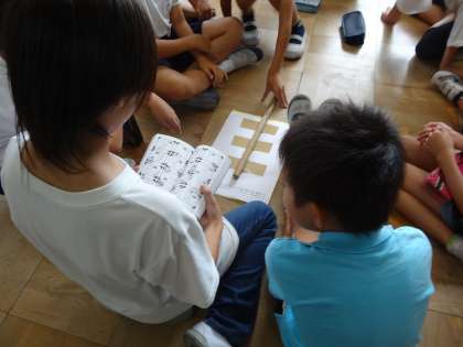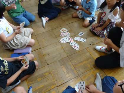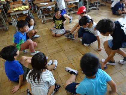 青組(1年)は,運動場での活動,黄色(2組)は,教室での活動でした。