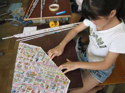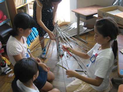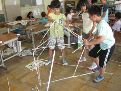 図画工作科の時間に,新聞紙やチラシを細く丸めて長い棒を作り,それを組み立てていろいろなものを作る造形遊びをしました。新聞紙やチラシを細く丸めるのも難しく,最初は苦戦していましたが,だんだん慣れてきて,何本も楽しんで作っていました。