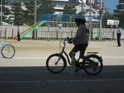 まずは,お手本を見て,練習をし,いよいよ検定。乗る前,止まるとき,降りるときに,周囲の様子を確かめることや細い道やジグザグの道を上手に走ることなど,気を付けて頑張りました。