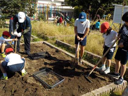 夏野菜を収穫した後の畑をみんなで耕しました。