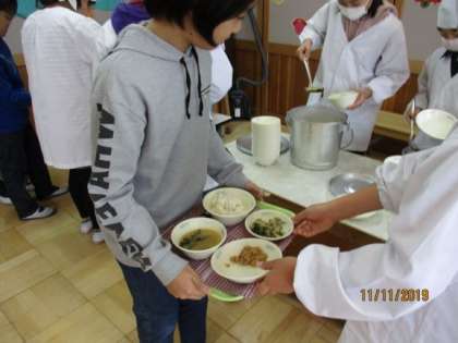 赤みそと信州みそを使った「みそ汁」,甘くてやわらかい「黒大豆」。