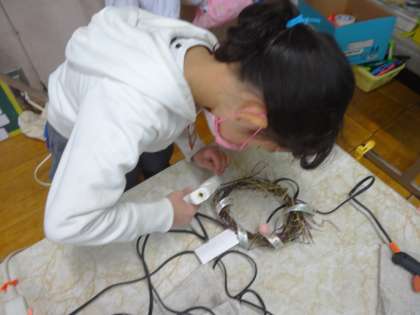 ホットボンドを使い,個性豊かなリースが完成しました。