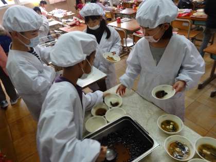 給食時間の様子です。2020年の最初の給食です。配膳当番や準備などスムーズにできるようになりました。