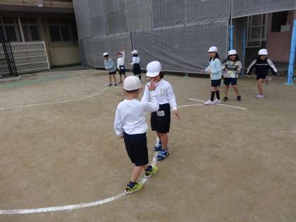 体育の授業風景です。2組は,平均台遊びと陣地取りをしました。これから授業を進めていくと平均台の歩き方を考えたり,陣地取りのコースを考えたりします。自分が考えたことを友だちに広げていきます。