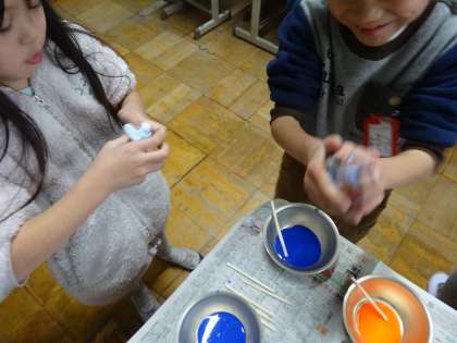 紙粘土に絵の具を混ぜてお団子やマカロン作りをしている様子です。