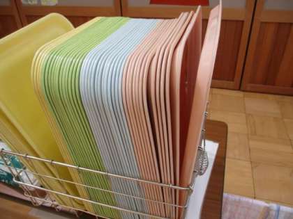 ランチハウスのお盆をピカピカに拭いて,