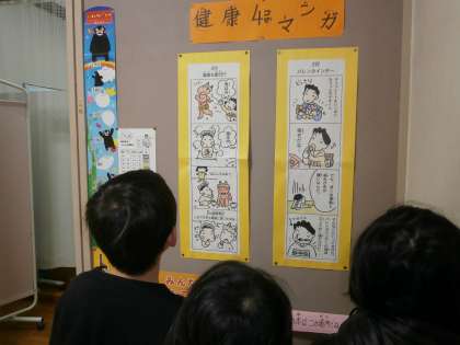 毎月の4コマ漫画を子どもたちはとても楽しみにしてくれています。今回の1つのタイトルは「バレンタインデー」。女の子にモテモテのもておくんは,チョコをいっぱいもらって食べます。しかし,歯みがきも運動も大嫌い・・・その結果は?