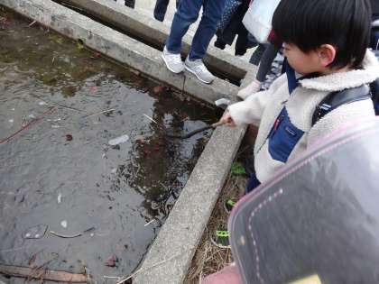 観察池に子どもたちの人だかりができているので,行ってみると池が凍っているではありませんか。枝で突いてみる人,実際に触ってみる人,様々です。子どもたちは大喜びの朝でした。