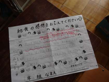 伏見南浜小の調理員さんは時に教室まで給食を食べている様子を見に来てくれます。そして子どもたちに丁寧に声をかけてくれます。また,毎日の献立表の裏には,お手紙がプリントされていて,そのお手紙に給食の感想を書いてポストに出すとお返事が返ってきます。調理員さんが心を込めてお返事を書いてくれるのです。今日の給食もおいしくいただきました。