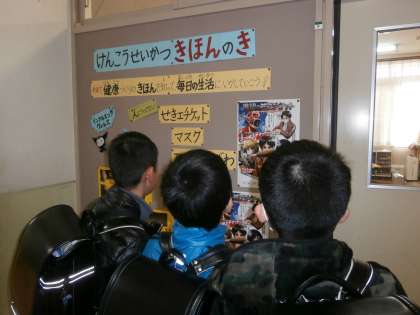 インフルエンザも新型肺炎も感染症の予防方法は同じです。せきエチケットについては,1月の身体計測前の保健指導で,具体的に子どもたちに指導しました。しかし人は忘れる動物です。大事なことは何度でも繰り返し伝えていきたいと思っています。引続きご家庭でもご協力をお願いします。
