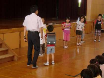 伏見警察の方に,不審者役をして頂き実践的な訓練ができました。子ども達は,「いかのおすし」行かない・乗らない・大声でさけぶ・すぐ逃げる・知らせる をしっかりと学習できました。 また,全校生徒が体育館に避難し伏見警察の方から防犯ブザーの使い方や,大声を出すこと,助けを呼ぶことなどを教えていただきました。