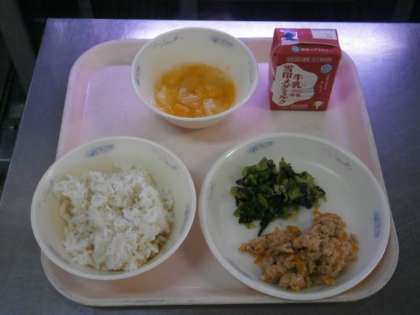 ・「フルーツかんてん」があまくて,いろいろなフルーツが入っていて,おいしかったです。「おからツナどんぶりのぐ」は,むぎごはんといっしょに食べて,ツナのあじとごはんのあじがまざって,おいしかったです。「こまつなのごまいため」はシャキシャキしていました。(3年)