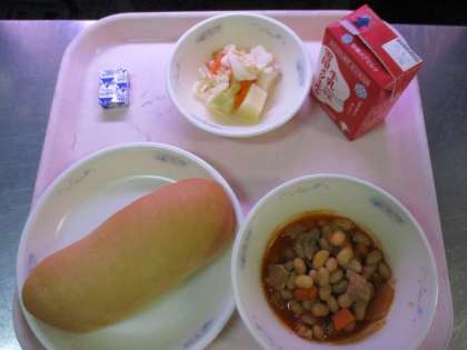 ・「ポークビーンズ」のいろがよかったです。「かくチーズ」がやわらかくて,おいしかったです。「ミルクコッペパン」がふわふわしておいしかったです。(1年)