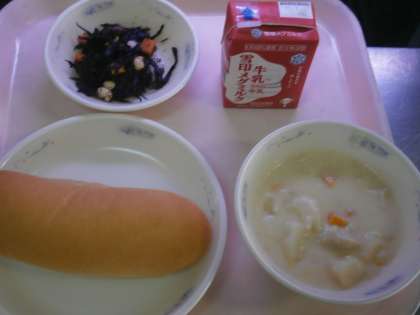 ・じゃがいものクリームシチューのじゃがいもがホワホワしていておいしかったです。ひじきのソテーは,一度に3つの豆が食べられ,ぜつみょうに3つの豆とひじきがマッチしていました。これからもおいしい給食を作ってください。(4年)