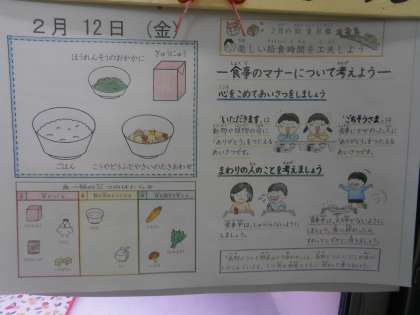 2月の給食目標は,「楽しい給食時間を工夫しよう」です。今年度は新型コロナウイルス感染症拡大防止のため,「黙食」をしている子どもたちですが,その分,動物や植物の命,給食に関わってくれたすべての人たちに心を込めて「いただきます」「ありがとう」のあいさつを心の中でしています。